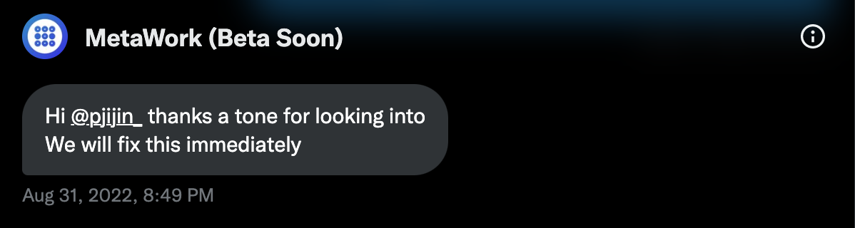 Identified and reported security vulnerability in MetaWork.Team platform.